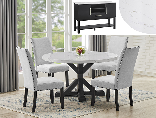 A fresh take on a traditional silhouette makes this group a great addition to your dining space. A faux marble top provides an elegant look while being easy to care for. Farmhouse style cross legs are updated in a contemporary charcoal finish. The parson style upholstered dining chairs feature nail head trim on the back. The coordinating sideboard is designed to elevate your living space with a perfect blend of functionality and style. Its elegant dark finish exudes sophistication, while the spacious interior offers a variety of storage options, including multiple open shelves, a central drawer, and cabinets with easy-access doors. Ideal for organizing and displaying your essentials, the sturdy structure promises durability and convenience, making it a versatile addition to any room. | | 1319RD-1320-SB VANCE FAUX ROUND TBL/SIDE CHAIRS