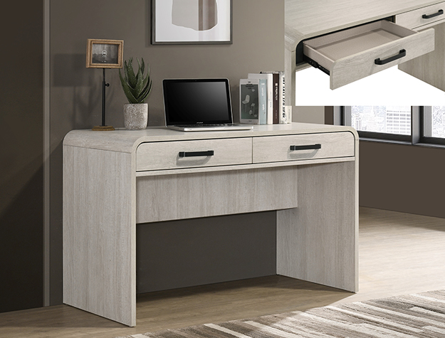 | With its clean silhouette and softly rounded edges, this modern desk brings an effortless sense of calm and functionality to any workspace. The light, neutral wood finish enhances its minimalist appeal, while the dual drawers with sleek, black pulls provide subtle contrast and practical storage. Its streamlined profile and flush design make it ideal for smaller offices or contemporary home settings, blending seamlessly with modern décor. Whether used for work, study, or creative pursuits, this piece balances style and purpose with refined simplicity. | B4900-DESK NYOMI WRITING DESK Qty SKU #