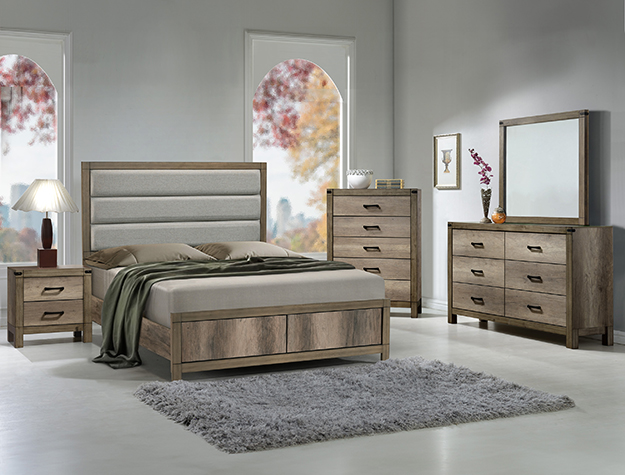 | This modern bedroom collection features a clean-lined design with a stylish weathered gray finish. Sturdy and practical, each piece is equipped with ample storage and smooth metal hardware. The bed's upholstered headboard is a standout element, making it the focal point of the room. This set is perfect for anyone looking to add a touch of contemporary sophistication to their bedroom without sacrificing functionality. | | SETB3202 MATTEO UPH HB BEDROOM GROUP